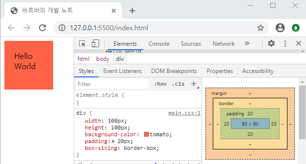- width: 100px; height: 100px;인 <div>에 상/하/좌/우 padding: 20px씩 붙임.