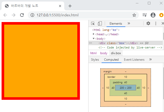 - 개발자도구의 computed 영역에는 각각 파랑, 초록, 노랑, 주황색 박스가 있음.