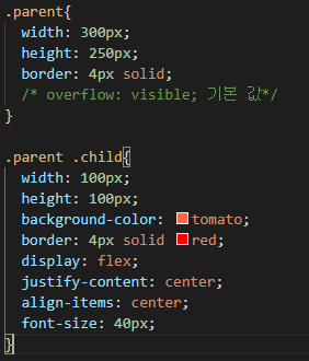 - 부모 요소의 영역 밖으로 자식 요소가 넘쳤을 때 넘친 영역을 어떻게 표시할 것인지에 대한 처리.