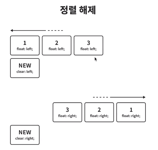 - float: left 사용 시 clear: left을 사용 해 해제, float: right; 사용 시 clear: right;를 사용해 해제.