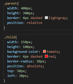 - 여기서는 부모 요소를 기준으로의 위치, 즉 어느 지점에 위치시킬 것인지에 대한 지정.