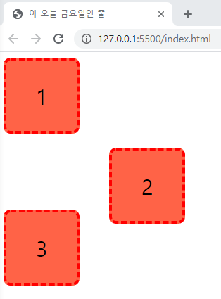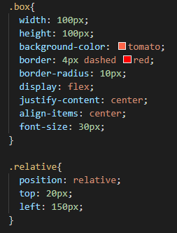 - position: relative;만 입력 시 자신을 기준으로 배치될 준비만 하는 것.