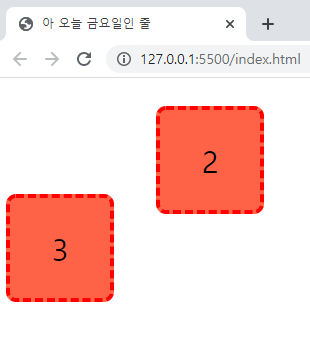 - position: relative;만 입력 시 자신을 기준으로 배치될 준비만 하는 것.