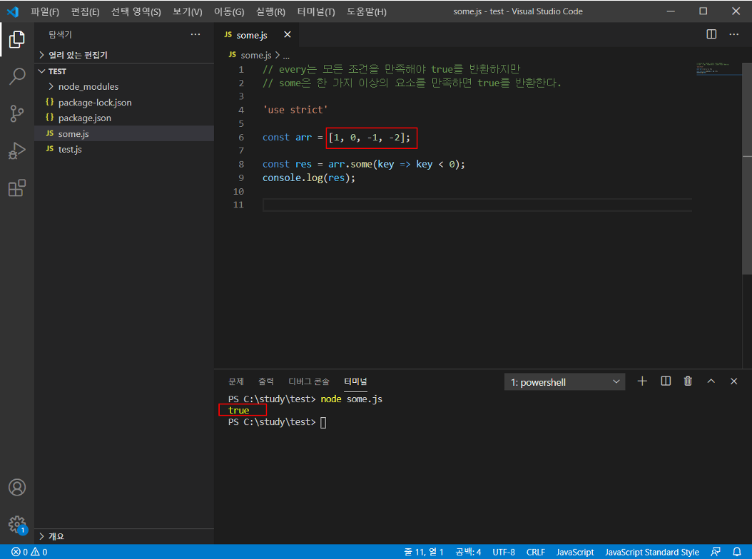 arr 안에 0보다 작은 숫자(-1, -2)가 존재하기 때문에 true가 반환