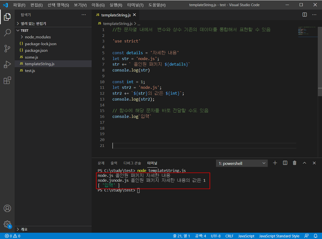 기존에 let str = 'node.js'; 라는 변수를 선언하고 여기에 문자를 결합하기 위해서는 아래와 같은 방식으로 문자열을 연결했다.