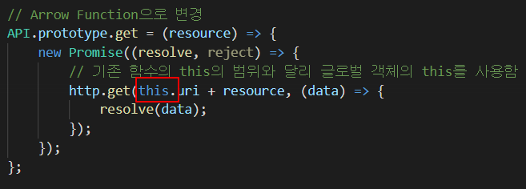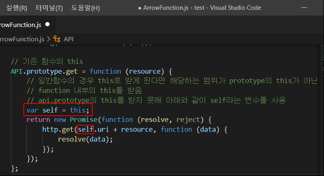 - 즉 api.prototype의 this를 받지 못해 아래와 같이 self라는 변수를 사용하여야 한다.