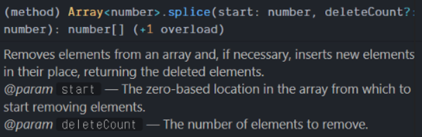 splice를 사용할 때 첫 번째 인자 값에는 시작점이고 두 번째 인자는 시작점부터 몇개까지 지울지를 적어준다.