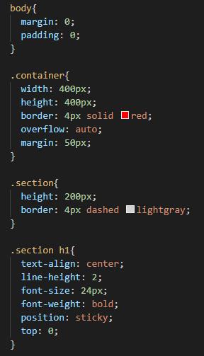 - position: sticky는 스크롤되는 영역 전체의 어딘가에 특정한 요소를 붙여 동작하는 것으로 스크롤과 연관이 깊은 속성의 값.