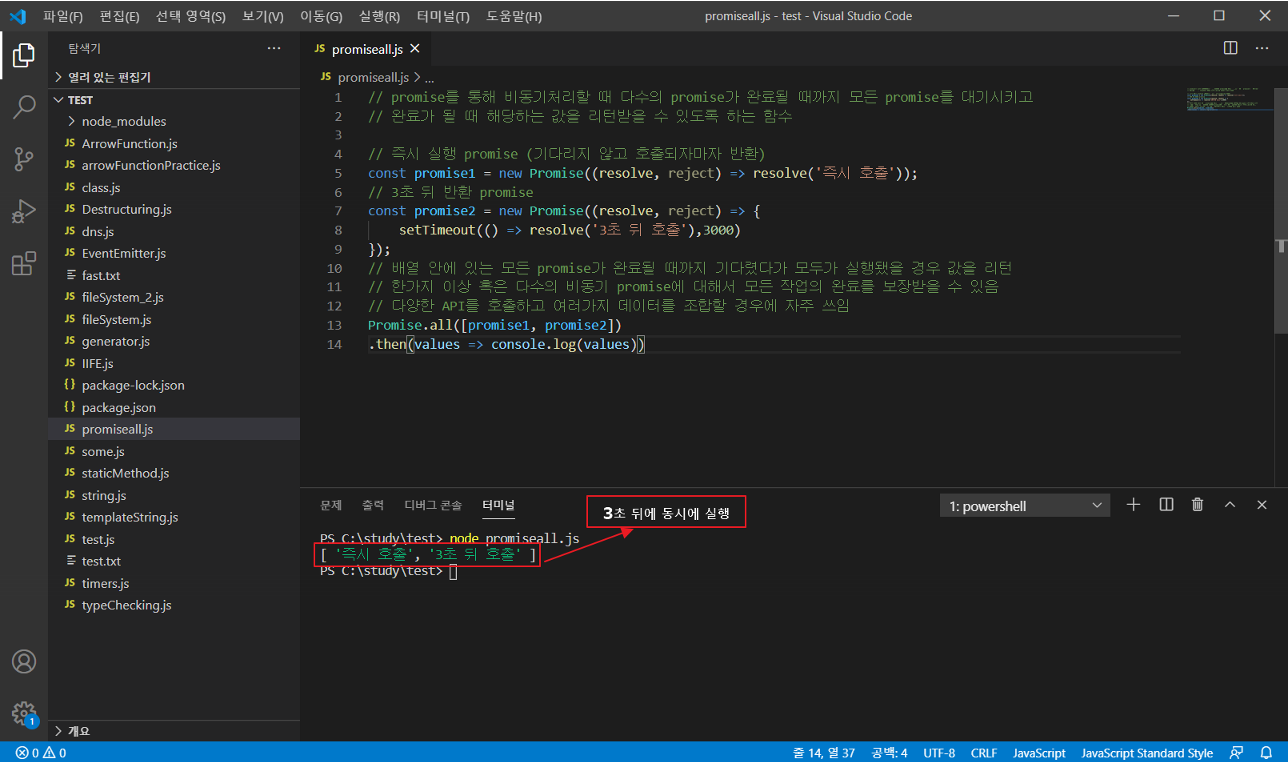 위에서 말한 promise.all의 특성으로 인해 모든 promise의 호출이 끝난 3초 뒤에 실행 된다.