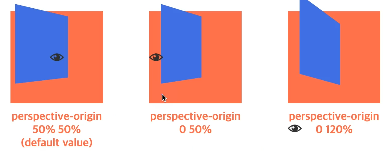 - perspective 속성은 관찰 대상이 여럿이기 때문에 부모/조상 요소에 적용하여 하위 요소들을 관찰하는 원근 거리를 설정.