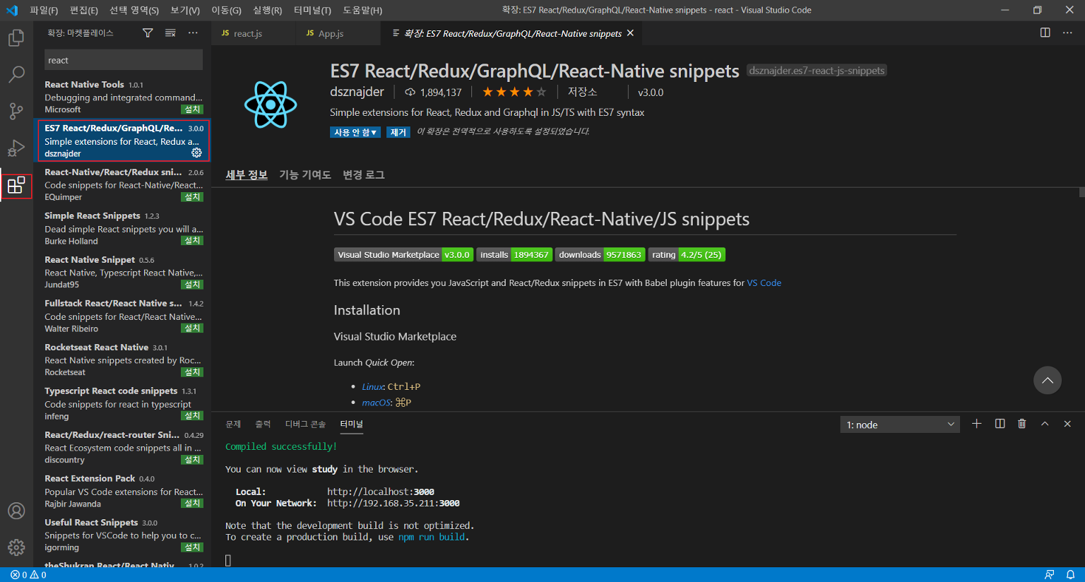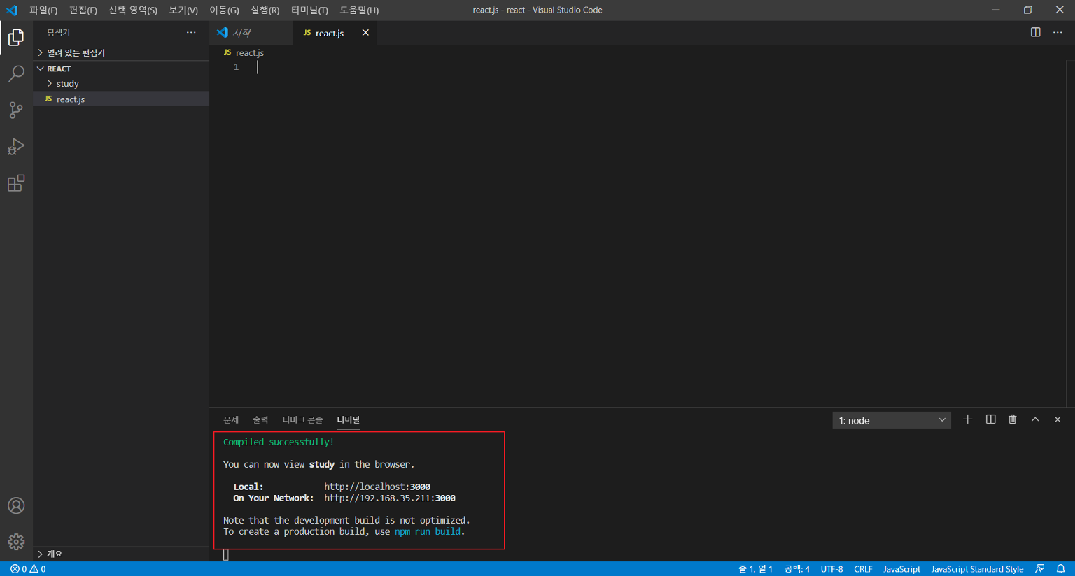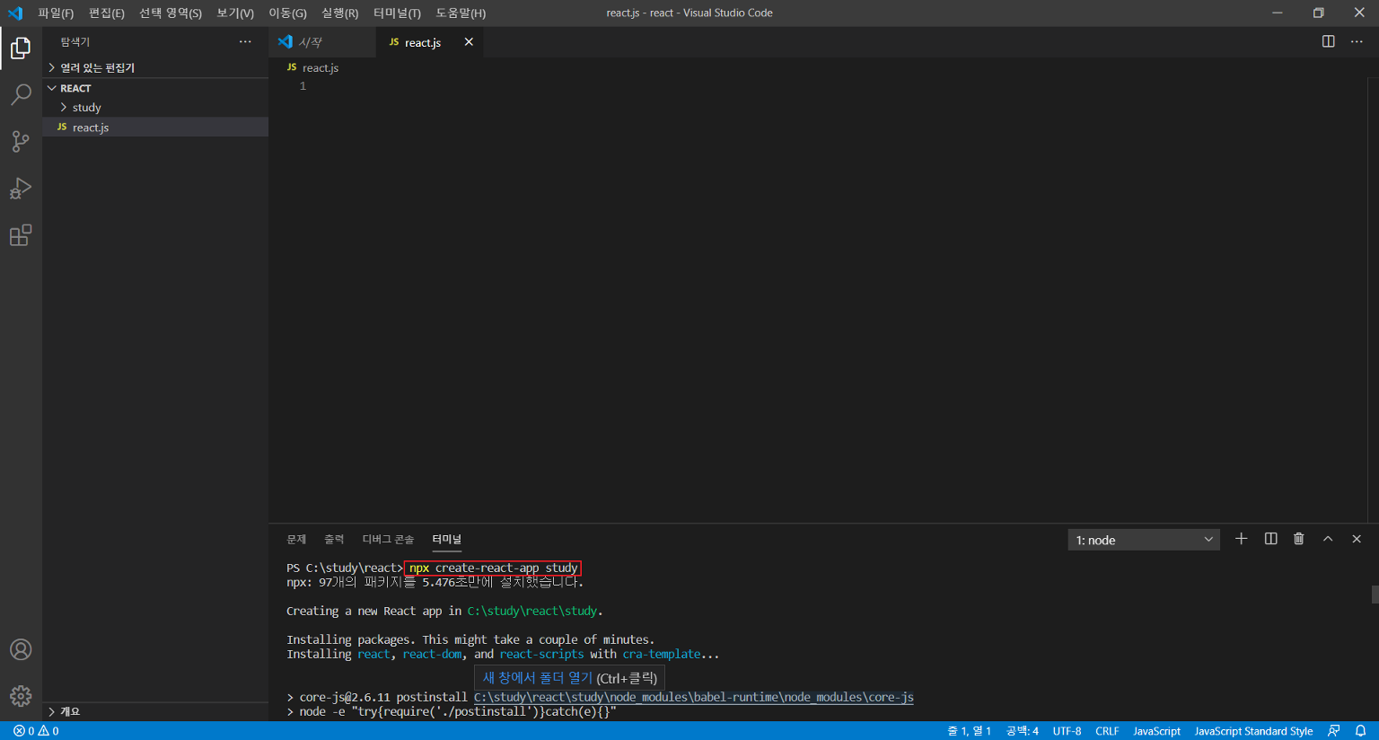 터미널에 npx create-react-app study 입력