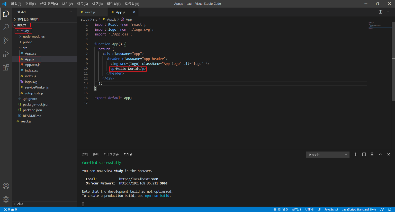 app.js파일의 p태그 시작부터 a태그 끝까지 지운 뒤 <p>hello World</p> 입력