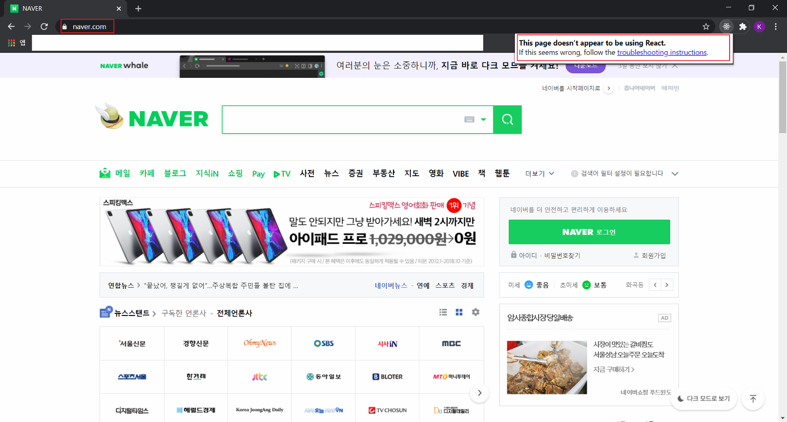 설치 후 react를 사용하는 사이트에 가면 아래와 같이 리액트 사용 중이라고 나옴
