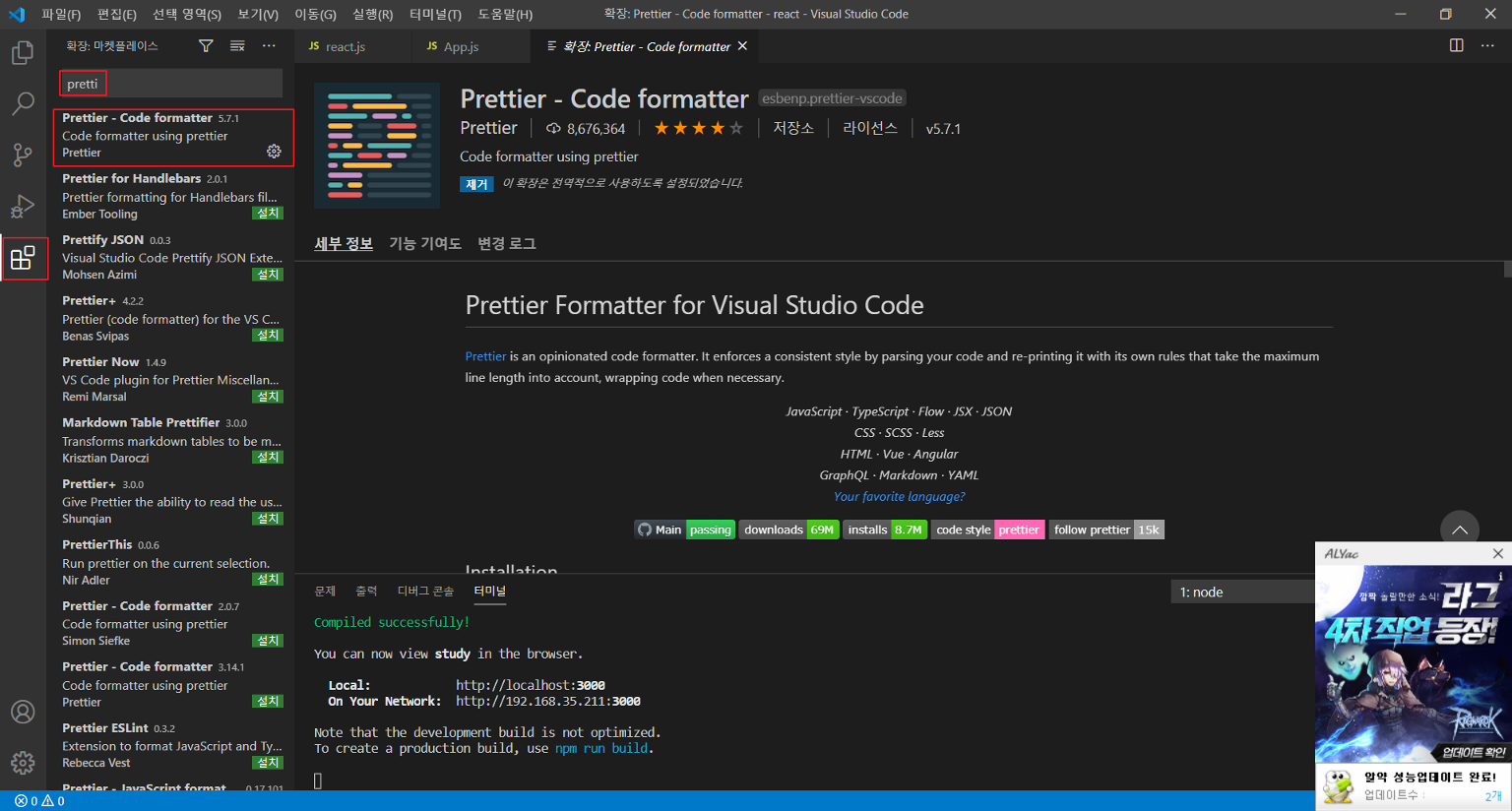 이후에 코드 가독성을 위한 Prettier 설치