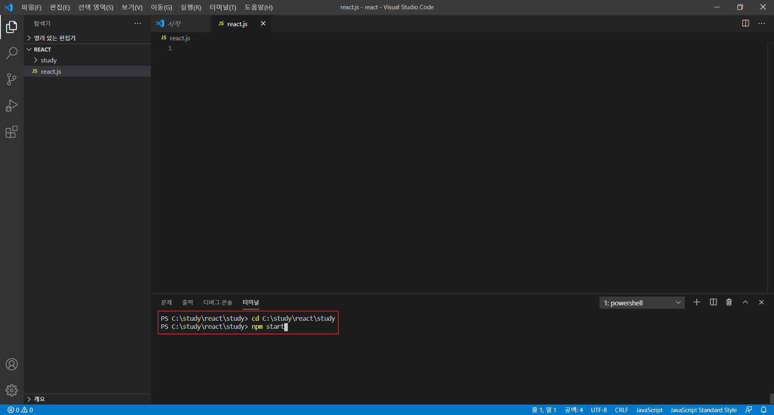 설치가 완료되었으면 설치된 프로젝트 경로로 이동 및 npm start