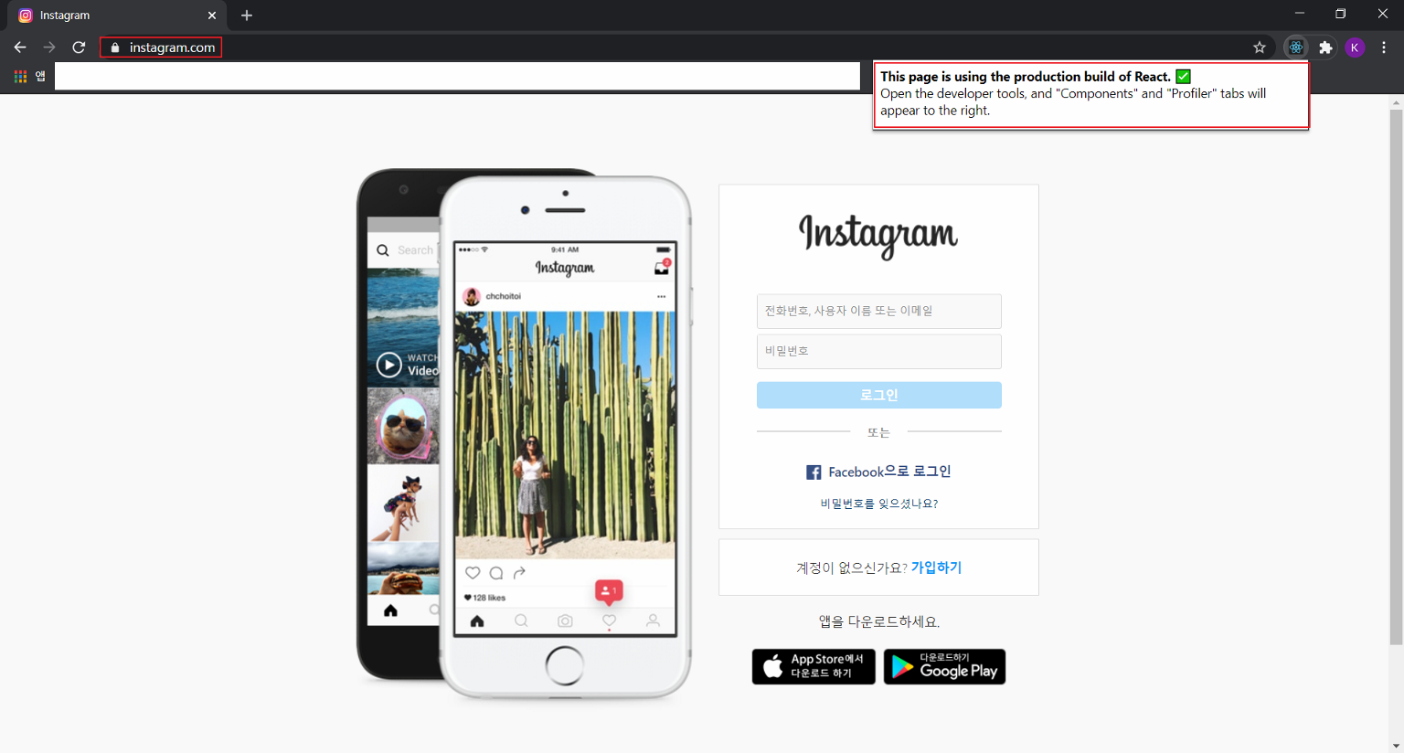 다시 instagram 페이지로 이동하여 개발자도구(F12)에서 아래와 같은 이미지가 확인 되면 정상적으로 chrome dev tool이 설치되었음을 알 수 있음