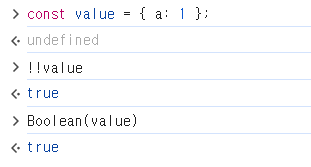 !value는 false가 되고 여기에 다시 !false는 true가 되어서 결과는 true가 되는 원리로, Boolean으로의 형변환을 하는 것과 동일한 결과를 얻을 수 있다.