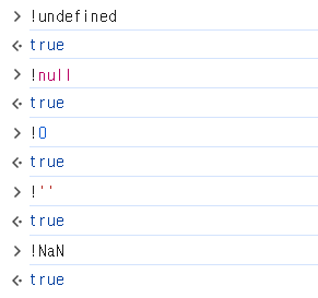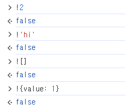 Falsy한 값은 지금 나열한 5가지이다. 그리고 그 외의 값은 모두 Truthy한 값이다. 아래와 같이 코드를 작성하면 이번에는 아까와는 다르게 모든 값이 false가 된다(!true이니 실행 결과는 false).