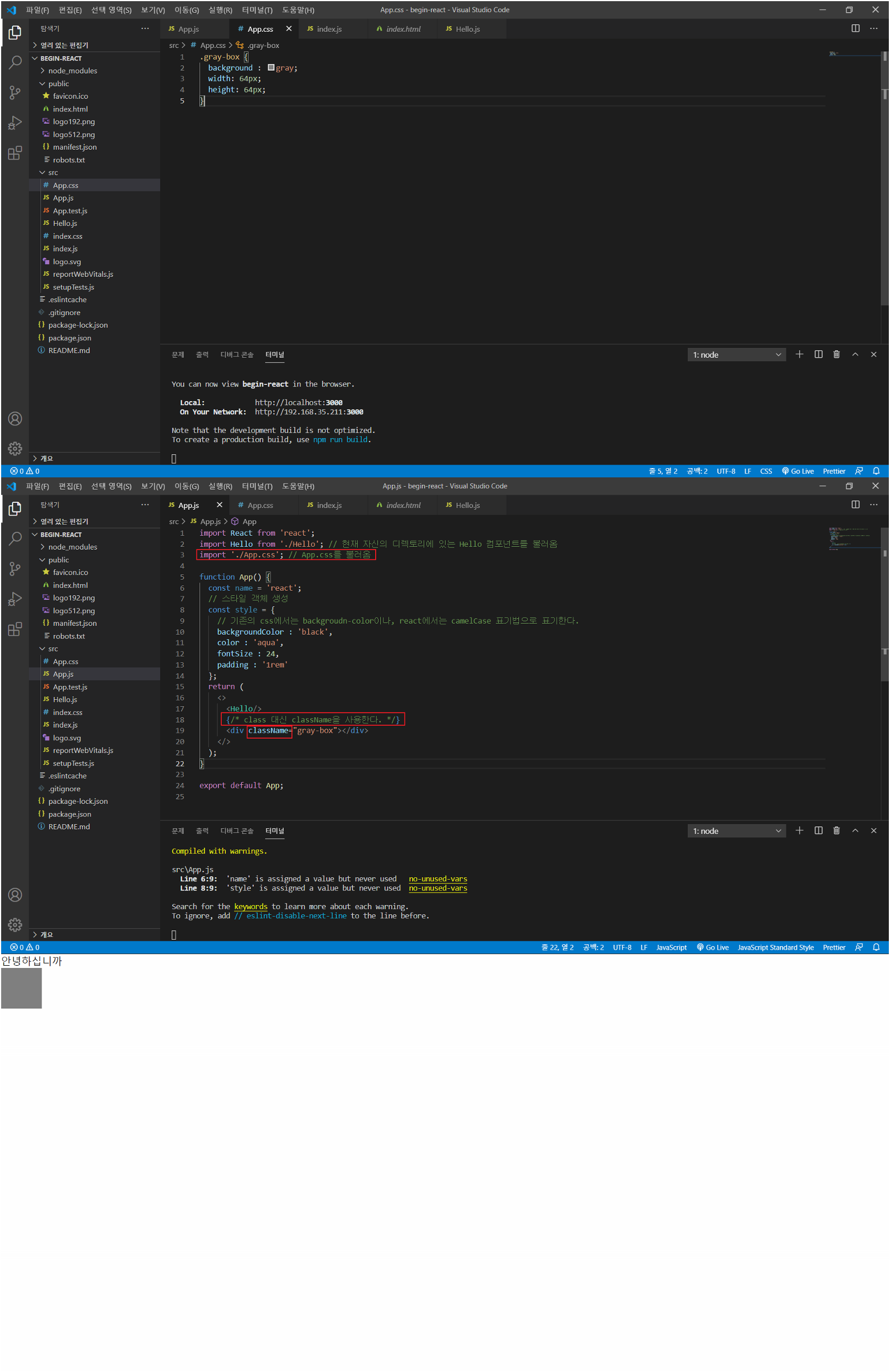 - class 적용 방법 (class 대신 className을 사용한다. 현재 버전에서는 class를 사용해도 작동은 하지만 스크립트 에러가 발생한다)