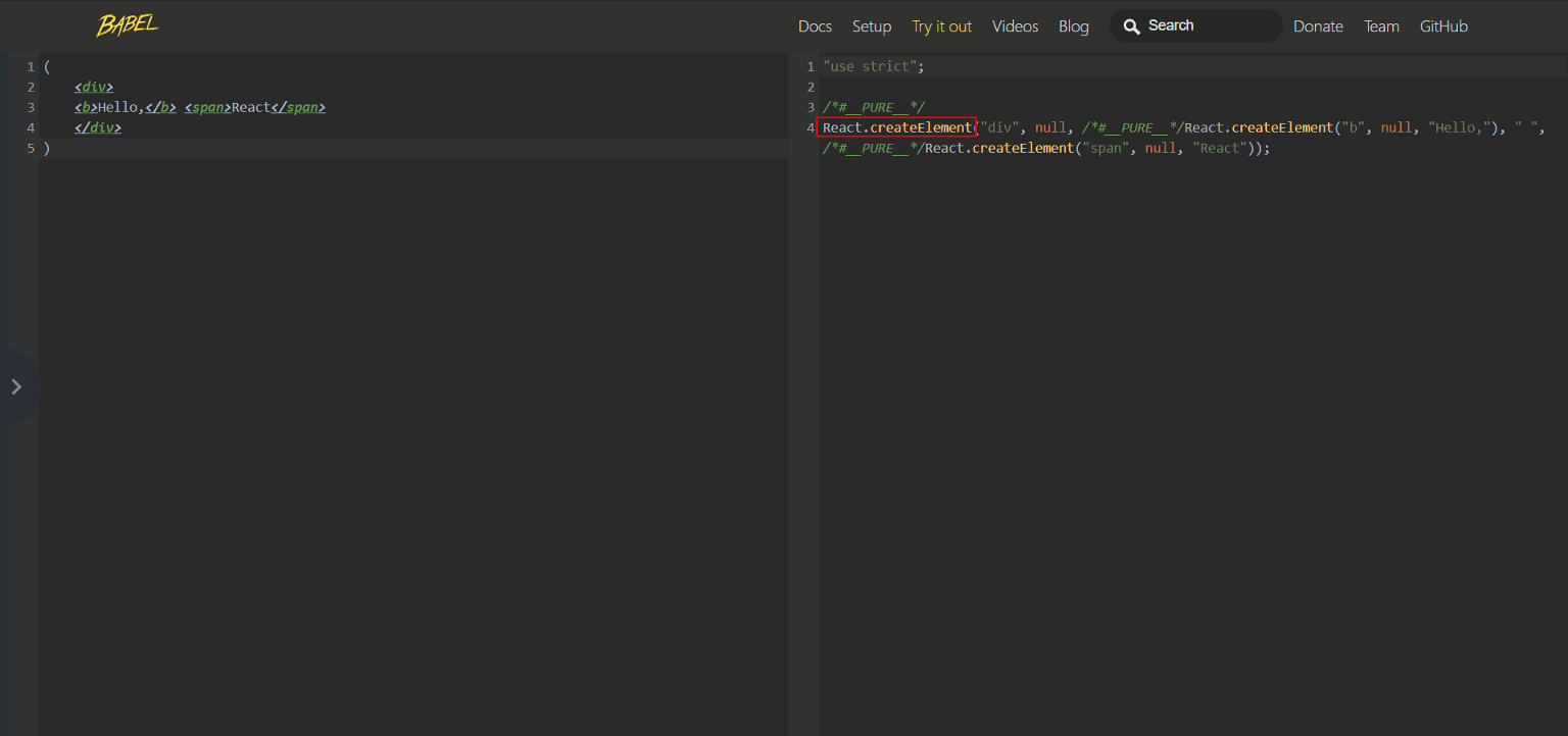 바벨이라는 도구를 사용하여 XML 형태의 코드가 Javascript로 변환이 된다.