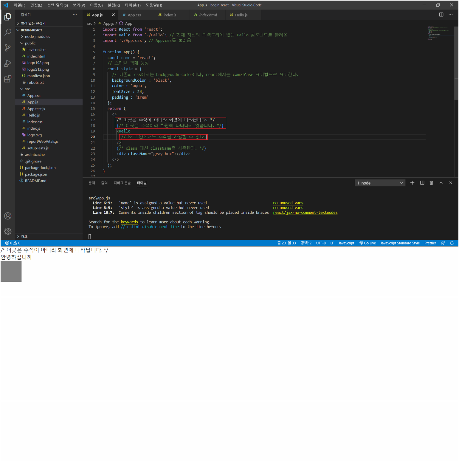 - Javascript 값을 jsx 내부에서 보여줄 때는 반드시 중괄호로 감싸줘야 한다.