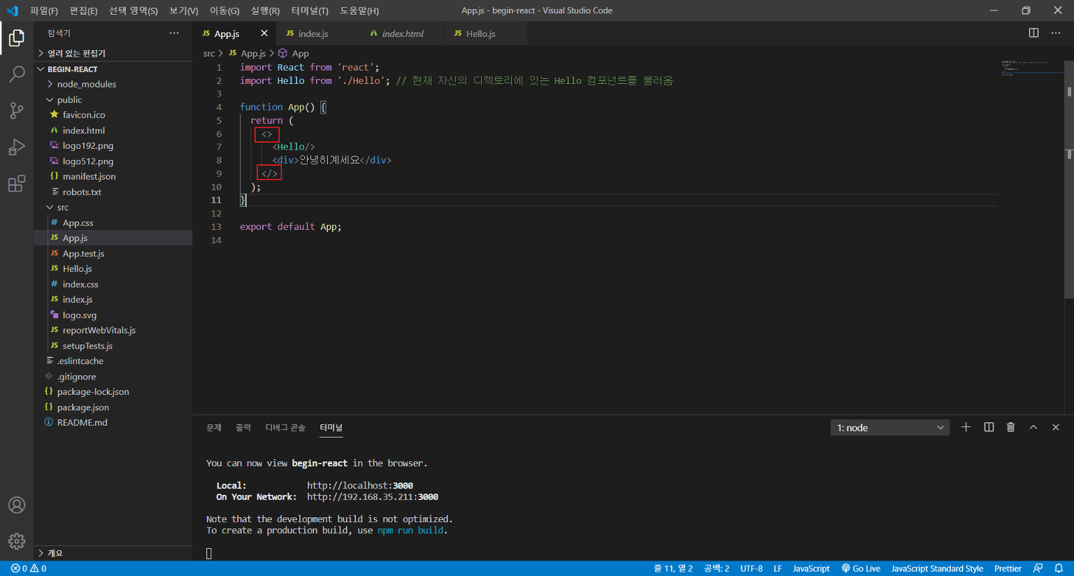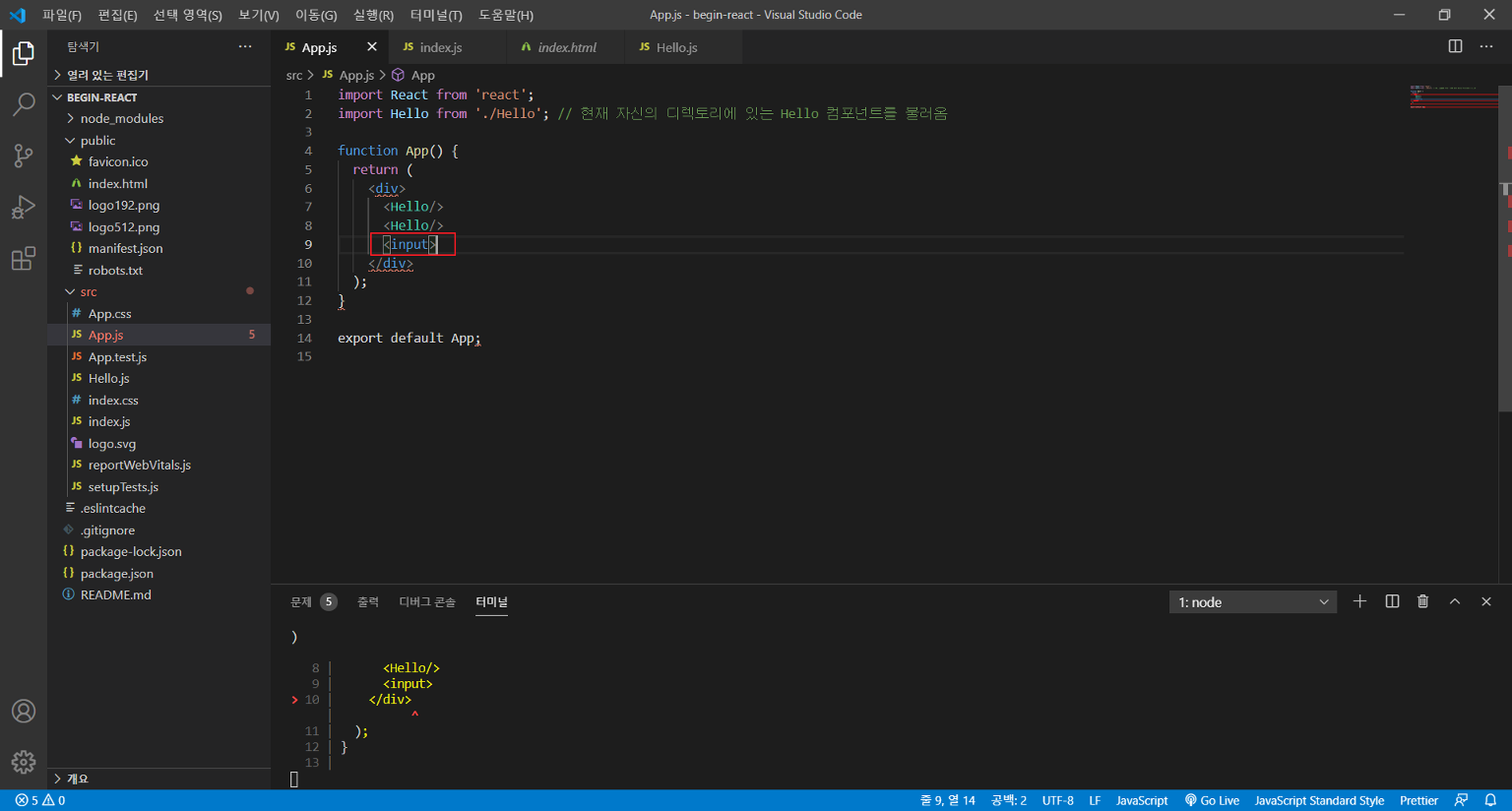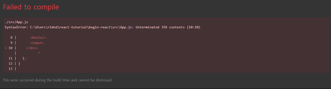 - 태그는 무조건 닫혀야 된다. (닫히는 태그가 없으면 에러가 발생한다) 간혹 HTML에서 INPUT이나 BR 태그는 닫지 않고 사용하는 경우가 있지만 리액트에서는 무조건 닫아줘야 한다.