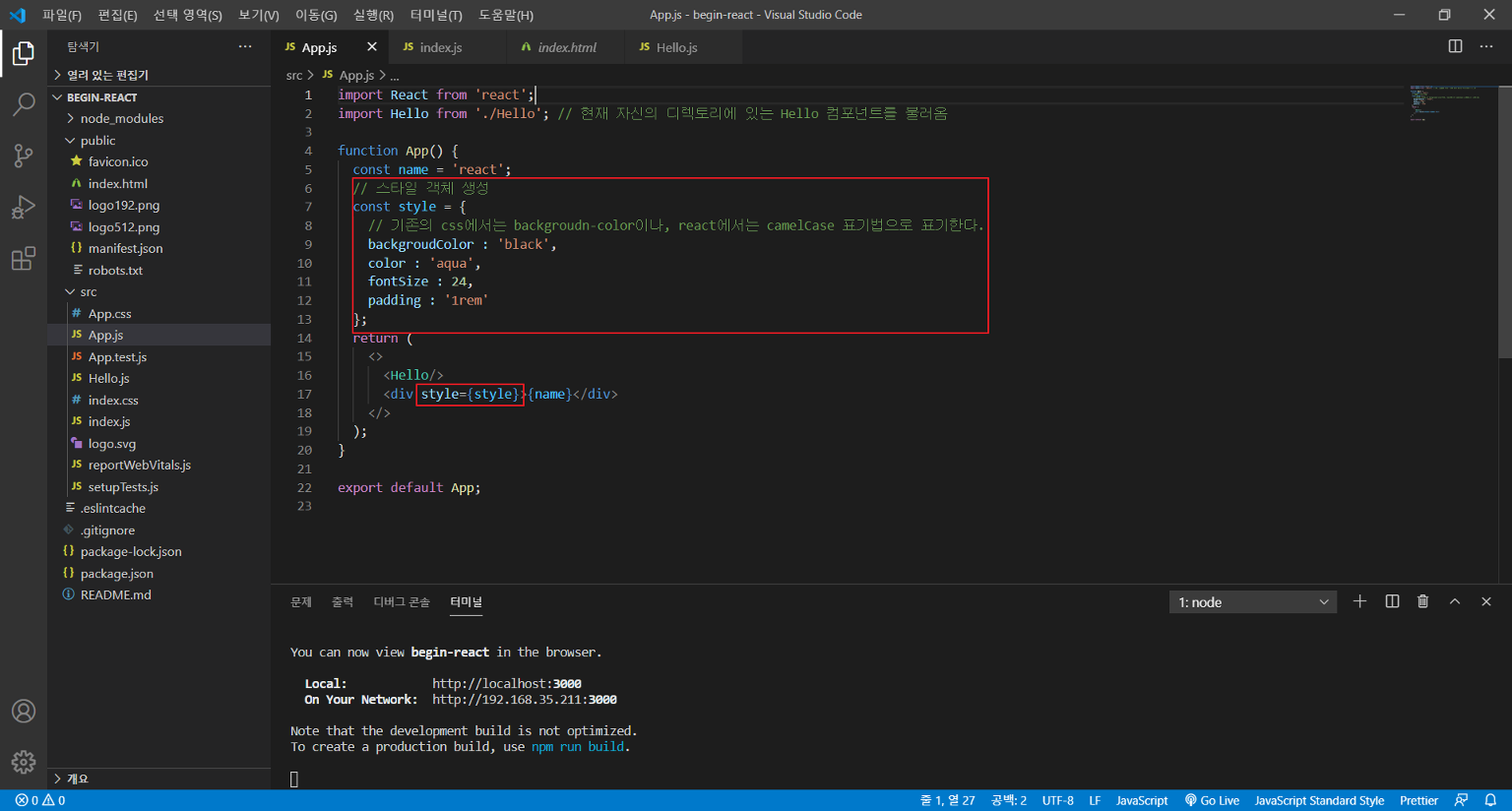 - jsx 내부에서 스타일을 사용할 때는 객체 형태로 넣어줘야 한다.