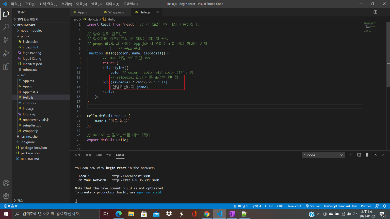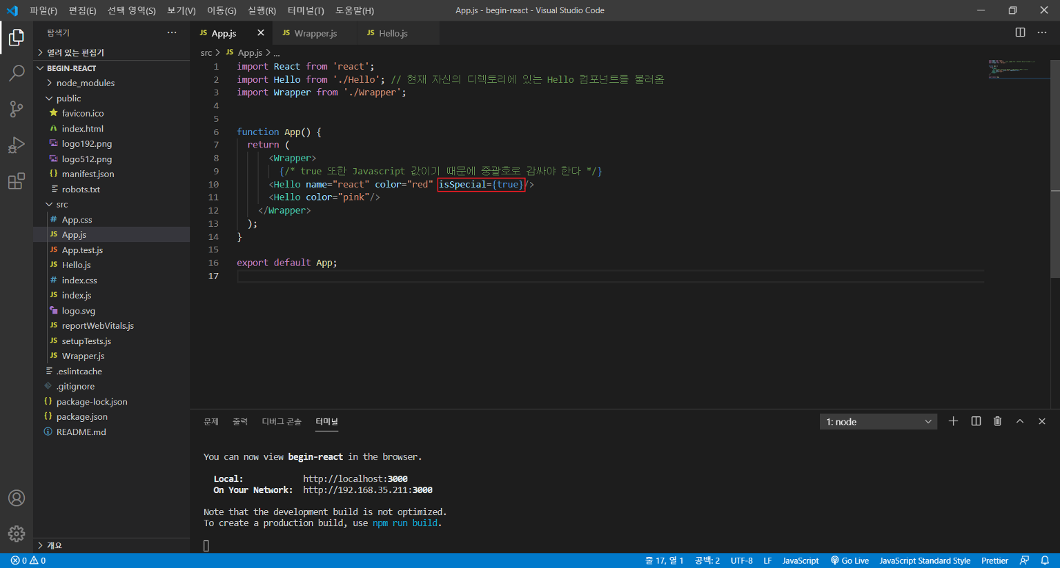 먼저 App.js의 Hello 태그 안에 isSpecial을 작성한다.
