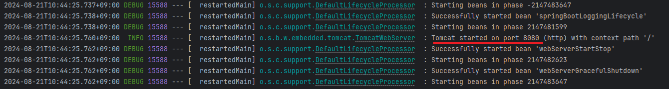 프로젝트를 실행시키고 로그를 보면 Spring Boot의 상징적인 기본 배너가 표시되고 Spring Boot의 버전이 확인되며 어떠한 환경들이 있는지, 그리고 로그 가장 마지막에는 Tomcat 서버가 시작되는 문구와 함께 몇 번 포트로 기동되었는지까지 확인이 가능함. 이렇게 웹 서버, 웹 애플리케이션 형태로 기본 프로젝트가 실행된 것을 확인할 수 있음.