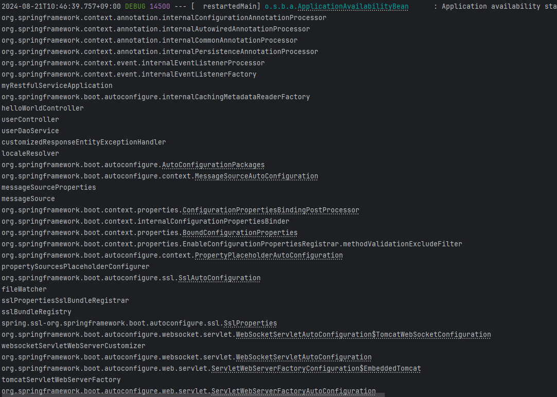이처럼 현재 Spring Context에 포함되어 있는 다양한 Bean들의 이름을 확인할 수 있음. 앞으로 개발을 진행하면서 사전에 등록된 이러한 Bean들을 사용할 수 있을 뿐 아니라 프로젝트 안에서 임의로 생성했던 컴포넌트나 객체들이 있다면 그러한 내용들도 Context에 등록해 사용할 수 있게 됨.