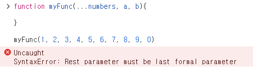 또한 Rest parameter는 함수를 정의할 때 매개변수의 수가 하나든 여러 개든 어떤 경우에도 반드시 매개변수의 가장 마지막에 위치해야 한다.