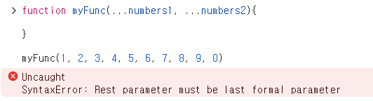 Rest parameter를 사용할 때에는 몇 가지 주의해야 할 점이 있는데 그중 첫 번째는 함수를 정의할 때에는 Rest parameter가 하나만 있어야 한다는 것이다. 그러므로 둘 이상의 Rest parameter를 선언할 경우 아래와 같이 오류가 발생한다.