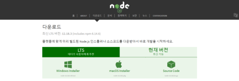 구글에 node download를 검색하여 다운로드 링크로 이동하거나