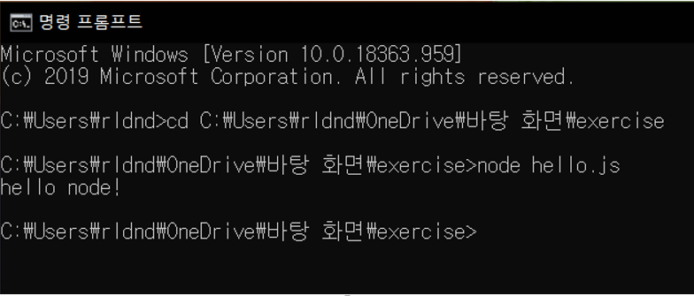 윈도우 기준 cmd 창을 열어 새로 생성한 폴더(exercise)로 이동 및 hello.js를 실행한다.