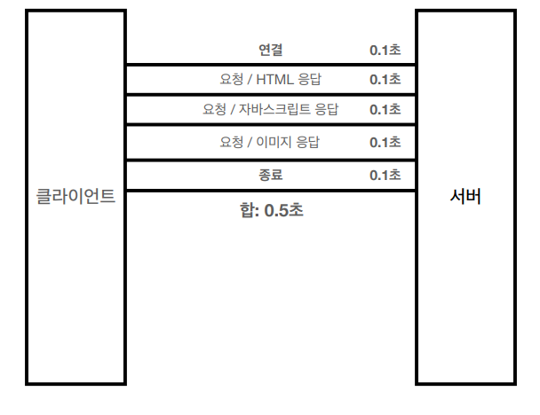 - 웹 브라우저로 사이트를 요청하면 HTML뿐만 아니라 js, css, 추가 이미지 등 수많은 자원이 함께 다운로드되는데 새로 연결을 맺을 때마다 TCP Handshake가 발생한다는 문제점이 있음.