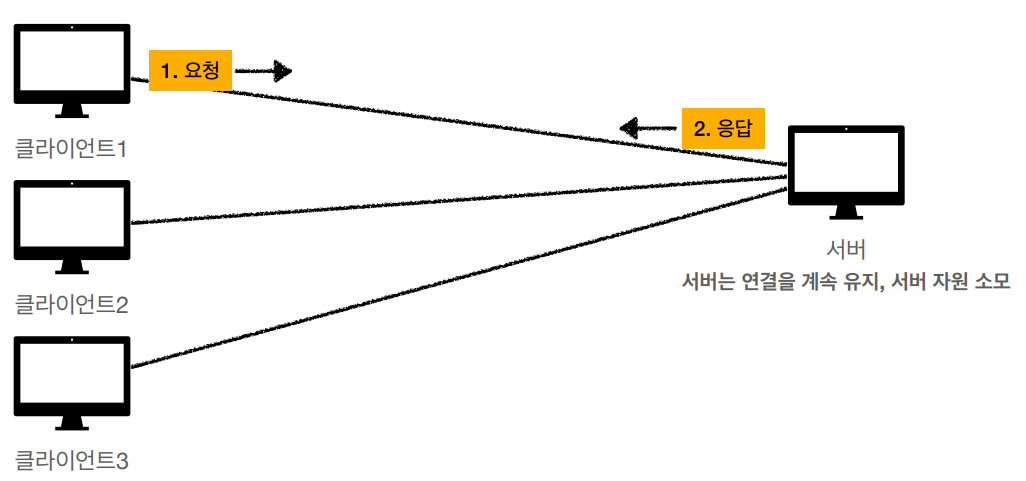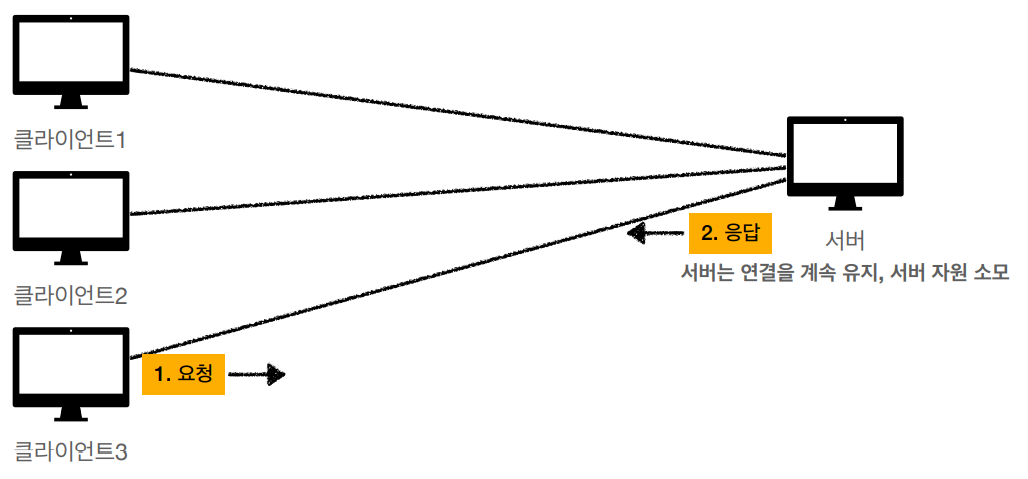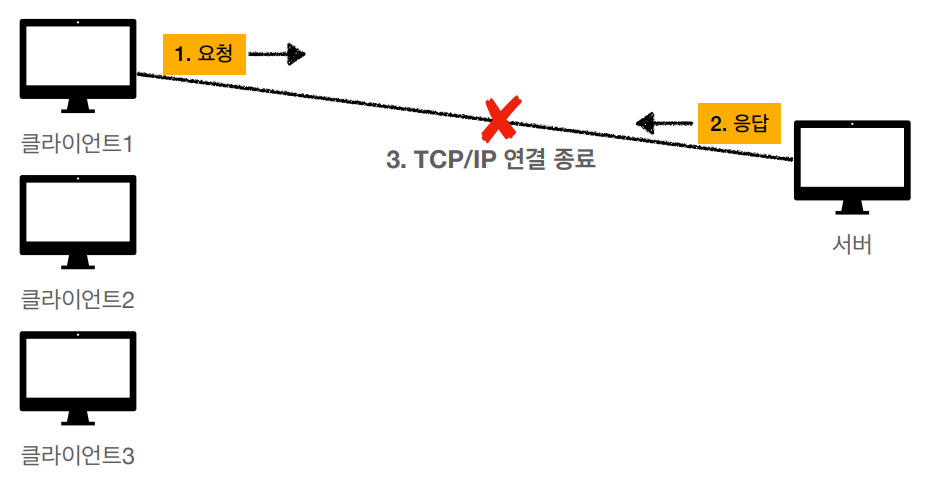 - 다만 클라이언트가 연결을 계속 끊는다는 것은 TCP/IP 연결을 매번 새롭게 맺어야 한다는 것을 뜻한다.