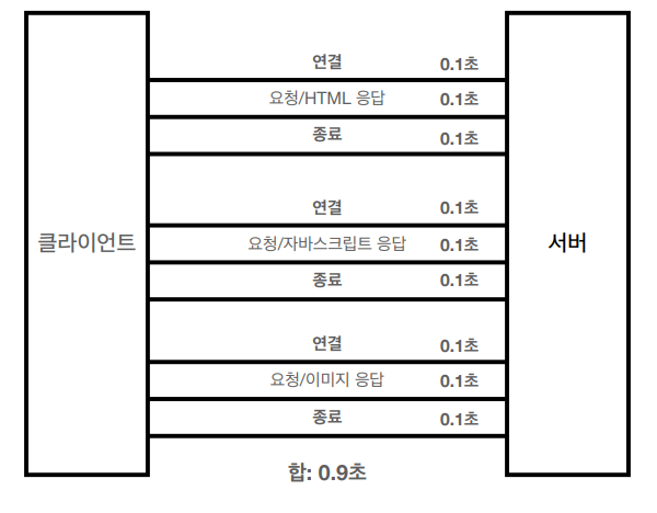 - 그래서 HTTP 초기에는 모든 자료에 대해서 비연결성으로 각각의 자원에 대해 연결/응답/종료를 반복하다 보니 대략적으로 1초 가량 소모됨.