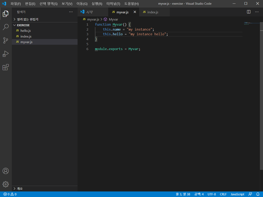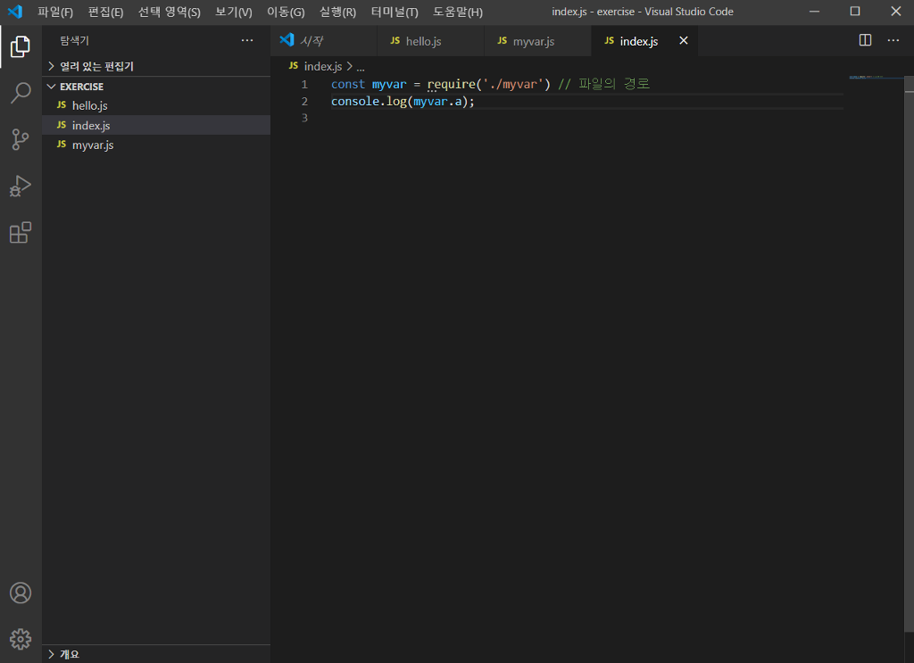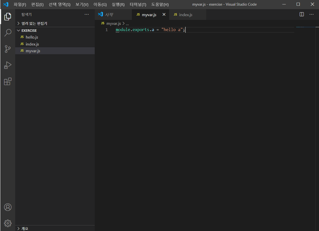 hello.js를 만들었을 때와 동일하게 myvar.js라는 파일을 생성한 후 module.exports.a = "hello a"; 작성