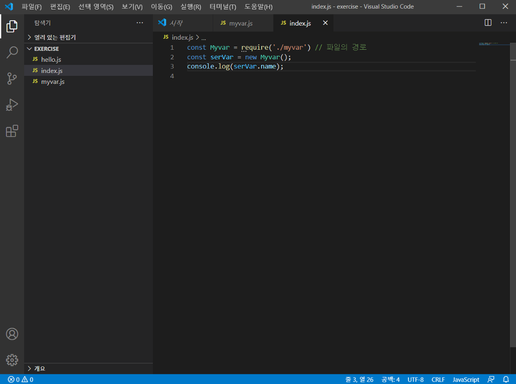 생성한 파일에 myvar 파일의 경로 작성 및 console.log()로 출력할 메시지 입력.