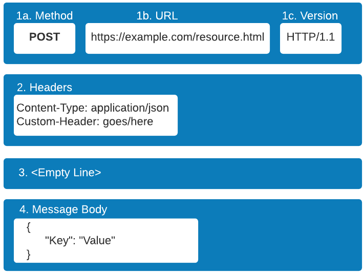 HTTP 메시지는 기본적으로 위에서부터 차례대로 시작 라인(Start Line), 헤더(Header), 공백 라인(Empty Line 또는 Blank Line), 바디(Message Body)로 구성되어 있다. 이중 공백 라인의 경우 HTTP 메시지 값 구분을 하기 위한 라인이므로 단순히 보기 편하게 넣는 것을 넘어서 반드시 있어야 한다. 만약 보낼 메시지 바디가 없다면 공백만 넣고 끝내면 된다. 또한 HTTP 요청 종류에 따라 Message Body가 포함될 수도 있고 아닐 수도 있다.