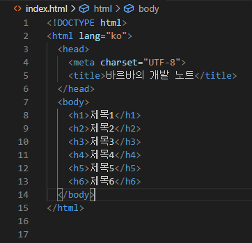 - <h1>~<h6>은 글자 크기를 지정하거나 구별하기 위한 것이 아니라 의미적으로는 대주제부터 여섯 단계의 소주제들을 구분할 때 사용.