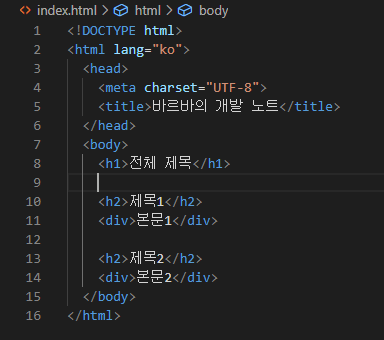 - 이와 같은 경우 아래와 같이 문서 전체 제목을 <h1>로 설정하고 <h2>를 여러 번 활용하는 것이 좋음.