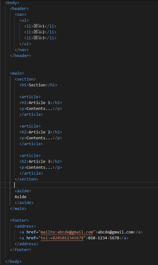 <body>, <article>, <footer> 등의 기타 영역에서 연락처 정보를 제공하기 위해 사용됨.