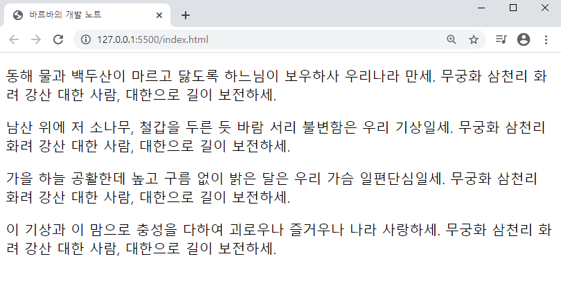 - '마르고 닳도록' 이후 코드상에서는 Enter를 입력했으나 실제 출력된 화면에서는 띄어쓰기가 입력됨.