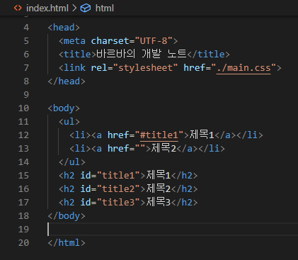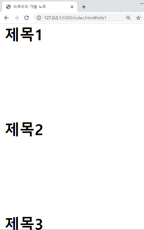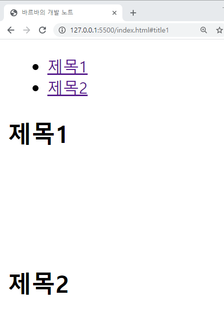 - <a href="#title">제목1</a> 클릭 시 가장 오른쪽 결과화면과 같이 같은 페이지 내의 <h2 id="title">제목1</h2>로 이동.