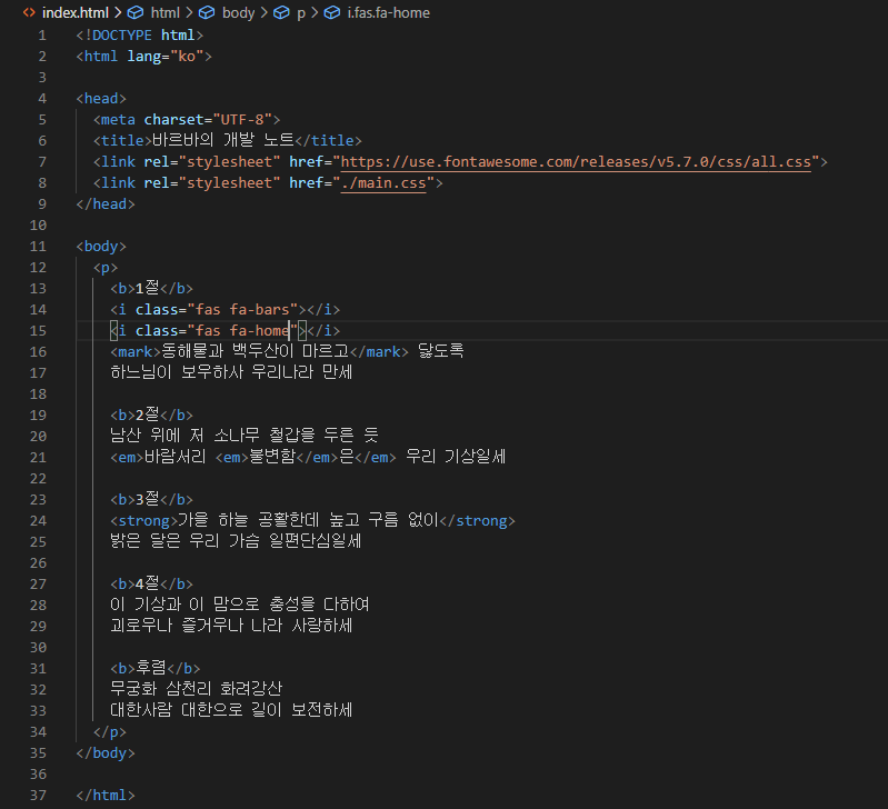 - <b>가 일반 텍스트 내에서의 구분인 것에 비해 <i>는 평범한 글자와의 구분(아이콘이나 특수기호 등)을 위해 사용. -