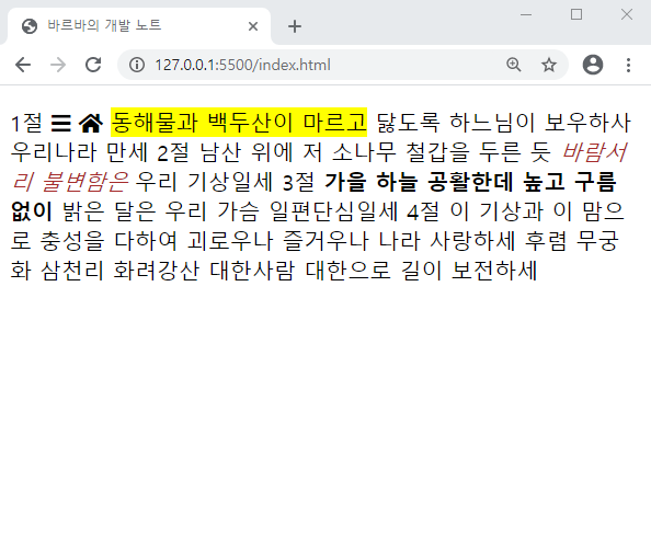 - <b>와 <strong>은 의미적으로는 다르지만 화면상에는 동일하게 표시됨.