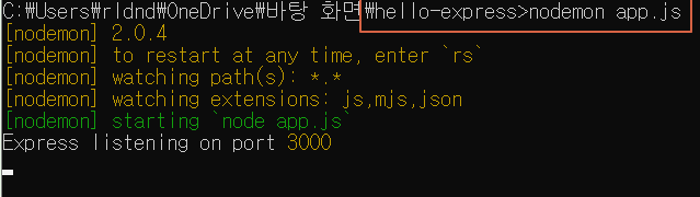 cmd 창을 켜놓고 nodemon으로 app.js를 실행하고 vscode에서 app.js를 수정하고 저장하면 서버가 올라갔다 내려갔다 하는 것을 직접 볼 수 있다.
