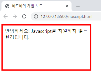 - 위의 예시에서는 자바스크립트가 실행 가능한 환경이기 때문에 <noscript> 내의 텍스트는 실행되지 않음.