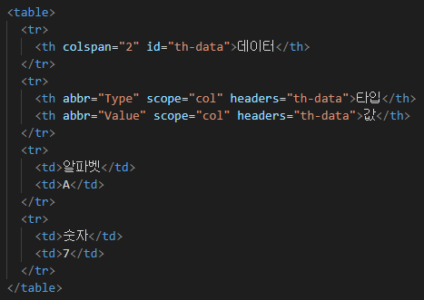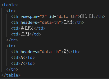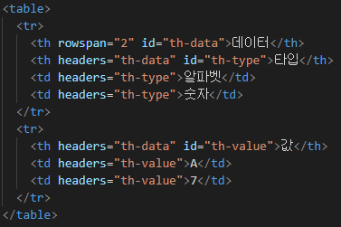 - <th headers="data-th">타입</th> 요소는 자신이 <th id="data-th">데이터</th>에 종속됨을 명시.